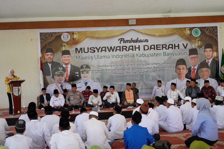 upzmerdeka,Pangkalan Balai- Wakil Bupati Banyuasin, Netta Indian,S.P resmi membuka Musyawarah Daerah ke-V Majelis Ulama Indonesia Kabupaten Banyuasin dengan tema, “ Membangun Sinergi antara Ulama dan Umaro’ untuk kemajuan bangsa sebagai pilar mewujudkan Banyuasin Religius, Adil, dan Sejahtera” di Pendopoan Rumah Dinas Bupati Banyuasin, Kamis (18/09).